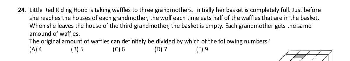 Q24. Little Red Riding Hood is taking waffles to three grandmothers. Initially her basket is completely full . Just before she reaches the houses of each grandmother, the wolf each time eats half of the waffles that are in the basket . When she leaves the house of the third grandmother, the basket is empty. Each grandmother gets the same amound of w affles . The original amount of waffles can definitely be divided by which of the following numbers ?