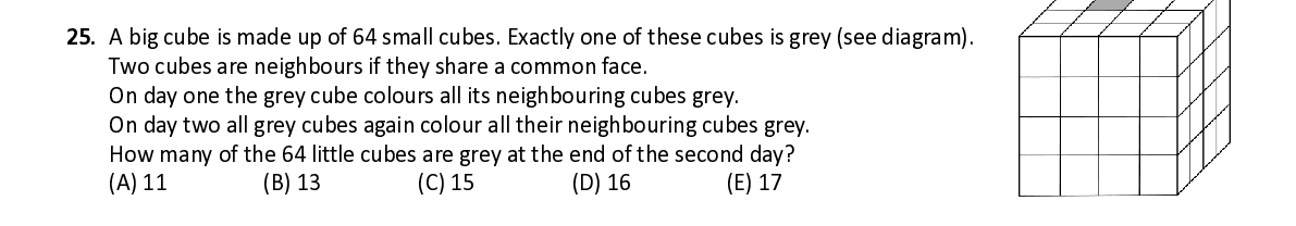Q25. A big cube is made up of 64 small cubes. Exactly one of these cubes is grey (see diagram). Two cubes are neighbours if they share a common face. On day one the grey cube colours all its neighbouring cubes grey . On day two all grey cubes again colour all their neighbouring cubes grey. How many of the 64 little cubes are grey at the end of t he second day ?