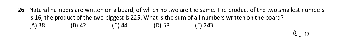 Q26. Natural numbers are w ritten on a board, of which no two are the same . The product of the two smallest numbers is 16, the product of the two biggest is 225 . What is the sum of all numbers written on t he board ?
