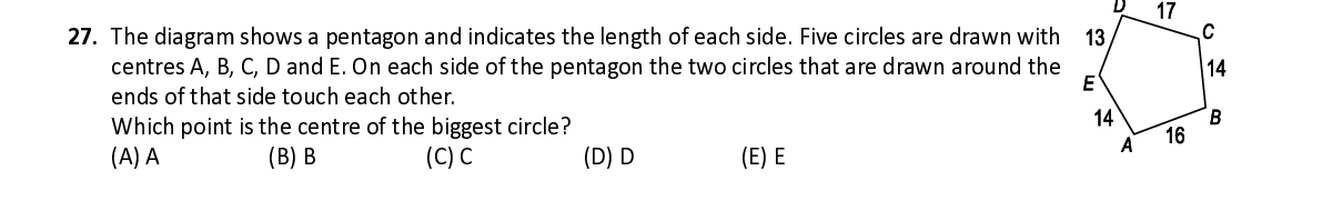 Q27. The diagram shows a pentagon and indicates the length of each side. Five circles are drawn with centres A, B, C, D a nd E. On each side of the pentagon the two circles that are draw n around the ends of that side touch each other. W hich point is the centre of the biggest circle ?