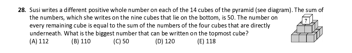 Q28. Susi writes a different positive whole number on each of the 14 cubes of the pyramid (see diagram ). The sum of the numbers, which she writes on the nine cubes that lie on the bottom, is 50. The number on every remaining cube is equal to the sum of the numbers of the four cub es that are directly underneath . What is the biggest number that can be written o n the topmost cube ?