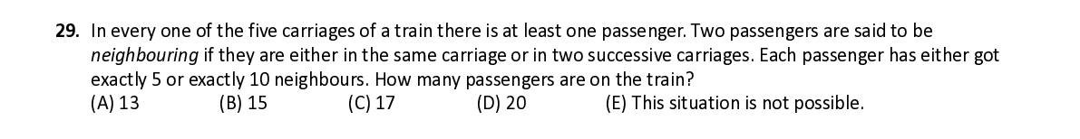 Q29. In every one of the five carriages of a t rain there is at least one passe nger. Two passengers are said to be neighbouring i f they are either in the same carriage or in two successive carriag es . Each passenger has either got exactly 5 or exactly 10 neighbours . How many passengers are on the train ?