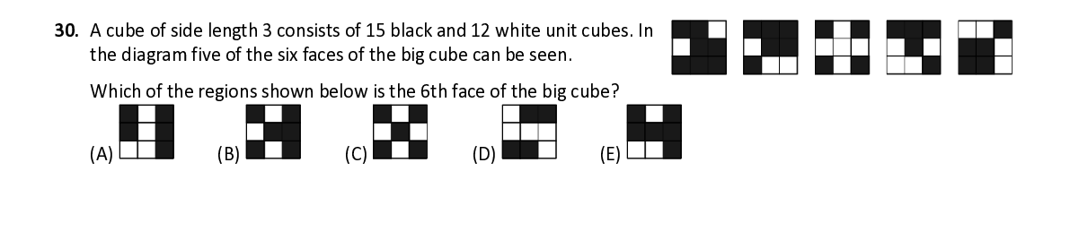 Q30. A cube of side length 3 consists of 15 black and 12 white unit cubes . In the diagram fi v e of the six faces of the big cube can be seen . W hich of the regions shown below is the 6th face of the big cube ?