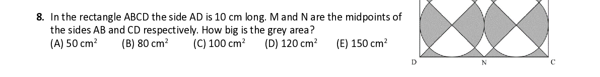 Q8. I n the rectangle ABCD the side AD is 10 cm l o ng. M a nd N are the midpoints of the sides AB a nd CD respectively . How big is the grey area?