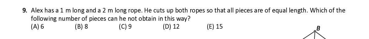 Q9. Alex ha s a 1 m lo ng a nd a 2 m l o ng rope . He cuts up both ropes so that all pieces are of equal length. Which of the following number of pieces can he not obtain in this way?