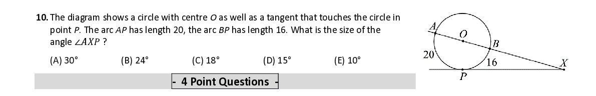 Q10. The diagram shows a circle with centre O as well as a tangent that touches the circle in point P . The arc AP ha s length 20, the arc BP has length 16. What is the size of the angle ∠ 퐴푋푃 ?