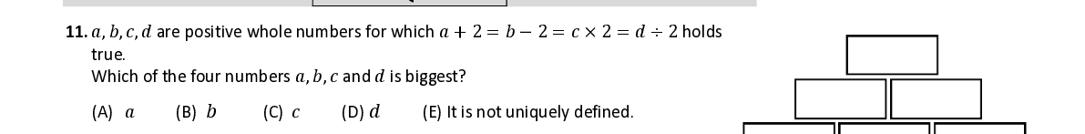 Q11. 푎 , 푏 , 푐 , 푑 are positive whole numbers for which 푎 + 2 = 푏 − 2 = 푐 × 2 = 푑 ÷ 2 holds true . Which of the four numbers 푎 , 푏 , 푐 a nd 푑 is biggest ?