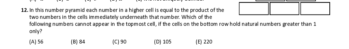 Q12. In this number pyramid each number in a higher cell is equal to the product of the two numbers in the cells immediately underneath that number. Which of the following numbers cannot appear in the topmost cell , if the cells on the bottom row hold natural numbers greater than 1 only ?
