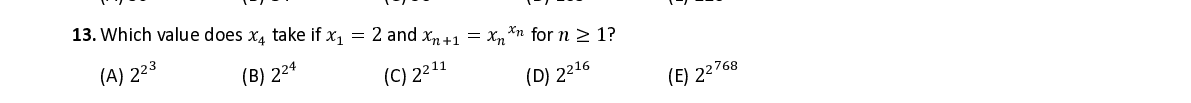 Q13. W hich value does 푥 4 take if 푥 1 = 2 a nd 푥 푛 + 1 = 푥 푛 푥 푛 for 푛 ≥ 1 ?