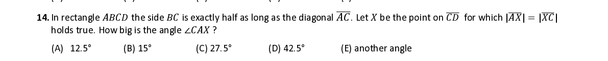 Q14. In rectangle 퐴퐵퐶퐷 the side 퐵퐶 is exactly half as long as the diagonal 퐴퐶 ̅ ̅ ̅ ̅ . Let 푋 be the point on ̅ 퐶퐷 ̅ ̅ ̅ for which | 퐴푋 ̅ ̅ ̅ ̅ | = | 푋퐶 ̅ ̅ ̅ ̅ | holds true . How big is the angle ∠ 퐶퐴푋 ?
