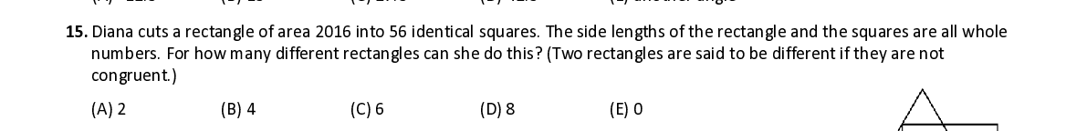 Q15. Diana cuts a rectangle of area 2016 into 56 identical squares . The side lengths of the rectangle and the squares are all whole numbers . For how many different rectangles can she do this ? ( Two rectangles are said to be different if they are not congruent .)
