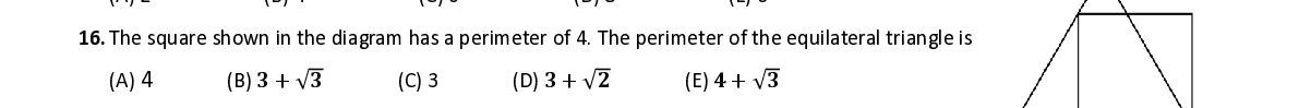 Q16. T he square shown in the diagram has a perimeter of 4. T he perimeter of the equilateral triangle is