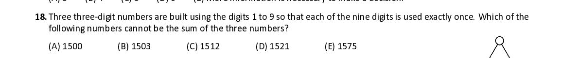 Q18. Thr ee three - digit numbers are built using the digits 1 to 9 so that each of the nine digits is used exactly once. Which of the following numbers cannot be the sum of the three numbers ?
