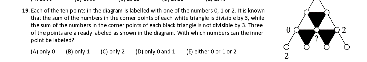 Q19. Each of the ten points in the diagram is labelled wit h one of the numbers 0, 1 or 2. It is known that the sum of the numbers in the corner points of each white triangle is divisible by 3, while the sum of the numbers in the corner points of each black triangle is not divisible by 3. Three of the points are a lready labeled as shown in the diagram. W ith which numbers can the inner point be labeled ?