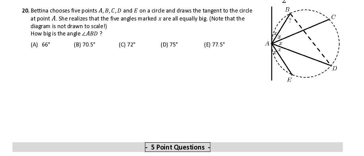 Q20. Bettina chooses five points 퐴 , 퐵 , 퐶 , 퐷 a nd 퐸 on a circle and draws the tangent to the circle at point 퐴 . She realizes that the five angles marked 푥 are all equally big . ( Note that the diagram is not draw n to scale !) How big is the angle ∠ 퐴퐵퐷 ?