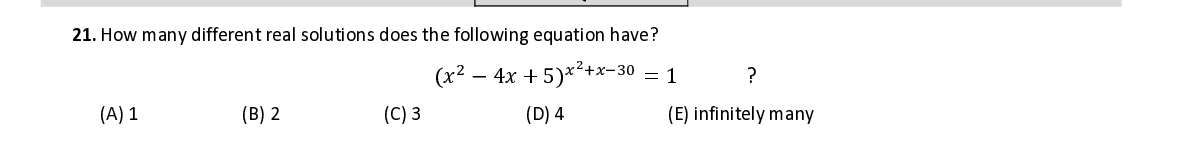Q21. How many different real solutions does the following equation have ?