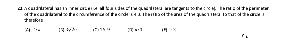 Q22. A quadrilateral has an inner circle (i.e. all four sides of the quadrilateral are tangents to the circle ). The ratio of the perimeter of the quadrilateral to the circumference of the circle is 4:3. The ratio of the area of the quadrilateral to that of the circle is therefore