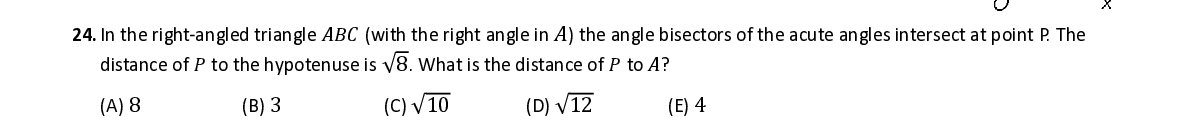 Q24. I n the right - angled triangle 퐴퐵퐶 ( with the right angle in 퐴 ) the angle bisectors of the acute angles intersect at point P . The distance of 푃 to the hypotenuse is √ 8 . What is the distance of 푃 to 퐴 ?