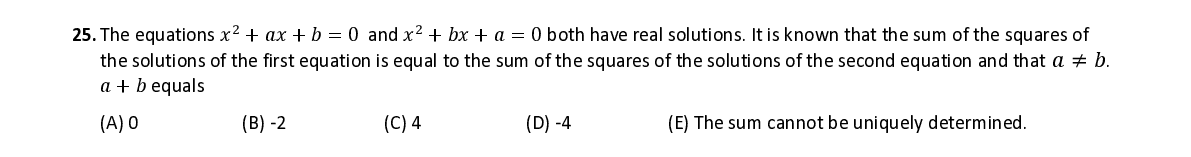 Q25. The equations 푥 2 + 푎푥 + 푏 = 0 a nd 푥 2 + 푏푥 + 푎 = 0 both have real solutions . It is known that the sum of the squares of the solutions of the first equation is equal to the sum of the squares of the solutions of the second equation and that 푎 ≠ 푏 . 푎 + 푏 equals