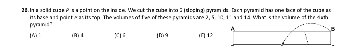 Q26. In a solid cube P is a point on the inside . We cut the cube into 6 ( sloping ) pyramids. Each pyramid has one face of the cube as its base and point P as its top . The volumes of five of these pyramids are 2, 5, 10, 11 a nd 14. What is the vo lume of the sixth pyramid ?