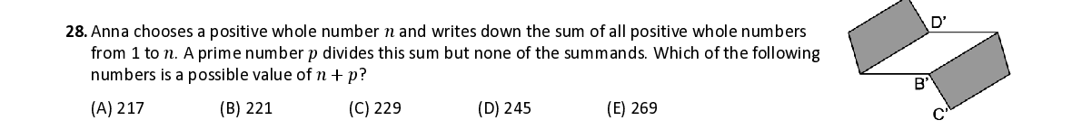Q28. Anna chooses a positive whole number 푛 a nd writes down the sum of all positive whole numbers from 1 to 푛 . A prime number 푝 divides this sum but none of the summands . Which of the following numbers is a possible value of 푛 + 푝 ?