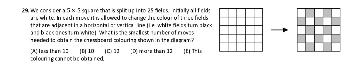 Q29. W e consider a 5 × 5 square that is split up into 25 fields . Initially all fields are white. In each move it is allowed to change the colour of three fields that are adjacent in a horizontal or vertical line ( i.e. white fields turn black and black ones turn white ). What is the smallest number of moves needed to obtain the chessboard colouring shown in the diagram ?