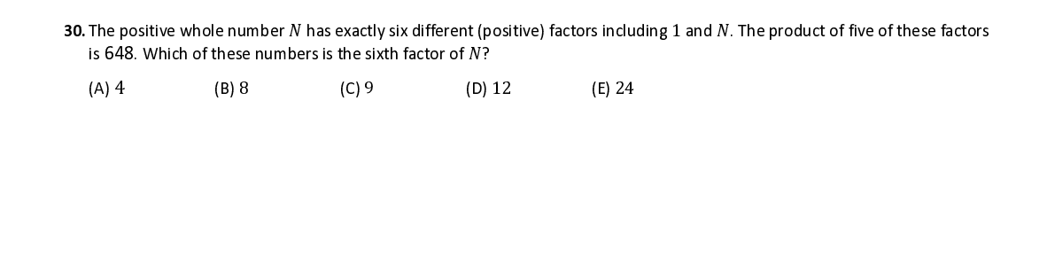 Q30. The positive whole number 푁 ha s exactly six different (positive) factors including 1 a nd 푁 . The product of five of these factors is 648 . Which of these numbers is the sixth factor of 푁 ?