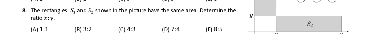 Q8. The rectangles 푆 1 a nd 푆 2 shown in the picture have the same area . Determine the ratio 푥 : 푦 .