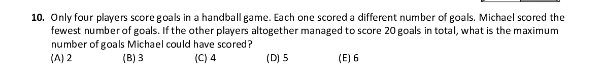 Q10. Only four players score goals in a handball game. Each one sco red a different number of goals. Michael scored the fewest number of goals. If the other players altogether managed to score 20 goals in total, what is the maximum number of goals Michael could have scored?