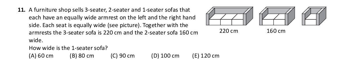 Q11. A furniture shop sells 3-seater, 2-seater and 1-seater sofas t hat each have an equally wide armrest on the left and the right han d side. Each seat is equally wide (see picture). Together with th e