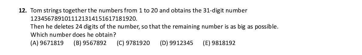 Q12. 567891011121314151617181920. Then he deletes 24 digits of the number, so that the remaining number is as big as possible. Which number does he obtain?