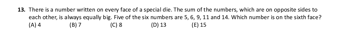 Q13. There is a number written on every face of a special die. The sum of the numbers, which are on opposite sides to each other, is always equally big. Five of the six numbers are 5, 6, 9, 11 and 14. Which number is on the sixth face?