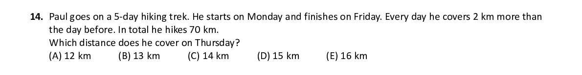 Q14. Paul goes on a 5-day hiking trek. He starts on Monday and finis hes on Friday. Every day he covers 2 km more than the day before. In total he hikes 70 km. Which distance does he cover on Thursday?