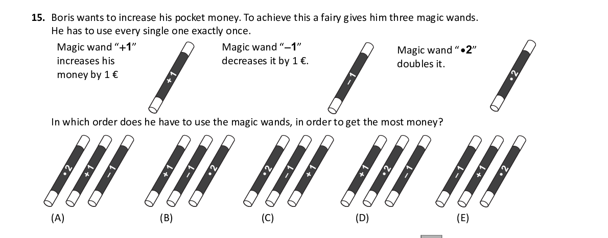 Q15. Boris wants to increase his pocket money. To achieve this a fa iry gives him three magic wands. He has to use every single one exactly once. Magic wand “ 1 ” Magic wand “ 1 ” Magic wand “ ∙ 2 ” increases his decreases it by 1 €. doubles it. money by 1 € •2 +1 –1 In which order does he have to use the magic wands, in order t o get the most money? •2 +1 –1 +1 –1 •2 •2 –1 +1 +1 •2 –1 –1 +1 •2