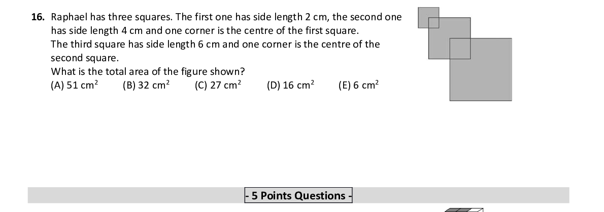 Q16. Raphael has three squares. The f irst one has side length 2 cm, the second one has side length 4 cm and one co rner is the centre of the first square. The third square has side length 6 cm and one corner is the ce ntre of the second square. What is the total area of the figure shown?