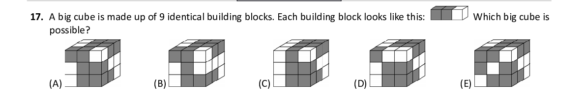 Q17. A big cube is made up of 9 ident ical building blocks. Each bui lding block looks like this: Which big cube is possible?