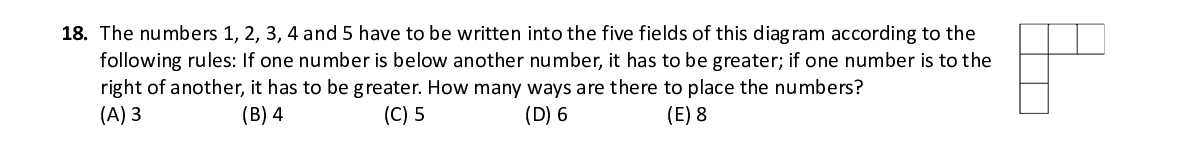 Q18. The numbers 1, 2, 3, 4 and 5 ha ve to be written into the five fields of this diagram according to the following rules: If one number is below another number, it has to be greater; if one number is to the right of another, it has to be greater. How many ways are there to place the numbers?