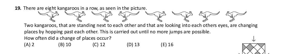 Q19. There are eight kangaroos in a row, as seen in the picture. Two kangaroos, that are standing next to each other and that a re looking into each others eyes, are changing places by hopping past each othe r. This is carried out until no more jumps are possible. How often did a change of places occur?