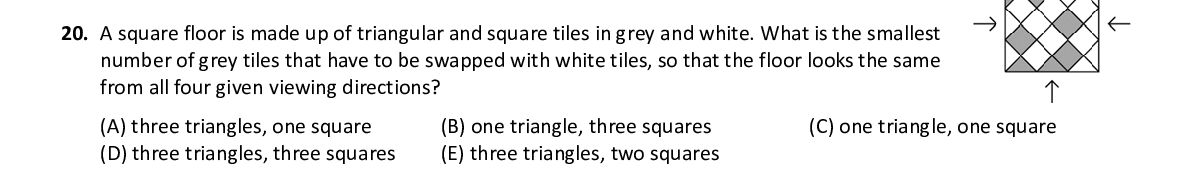 Q20. A square floor is made up of triangular and square tiles in gr ey and white. What is the smallest number of grey tiles that have to be swapped with white tiles, so that the floor looks the same from all four given viewing directions?