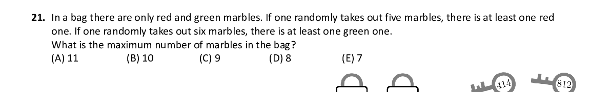 Q21. In a bag there are only red and green marbles. If one randomly takes out five marbles, there is at least one red one. If one randomly takes out six marbles, there is at least o ne green one. What is the maximum number of marbles in the bag?