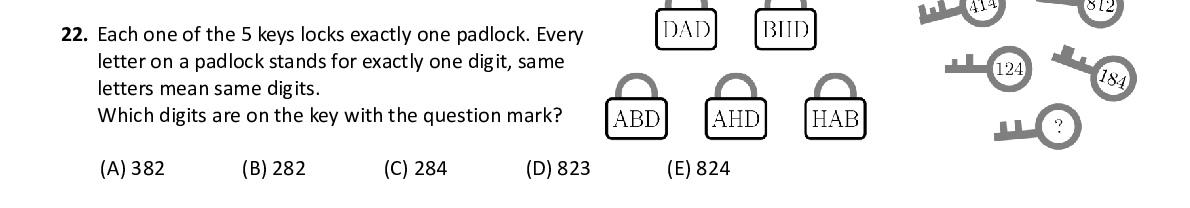 Q22. Each one of the 5 keys locks exactly one padlock. Every letter on a padlock stands for exactly one digit, same letters mean same digits. Which digits are on the key with the question mark?