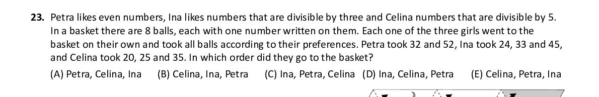 Q23. Petra likes even numbers, Ina likes numbers that are divisible by three and Celina numbers that are divisible by 5. In a basket there are 8 balls, each with one number written on them. Each one of the three girls went to the basket on their own and took all balls according to their prefe rences. Petra took 32 and 52, Ina took 24, 33 and 45, and Celina took 20, 25 and 35. In which order did they go to th e basket?