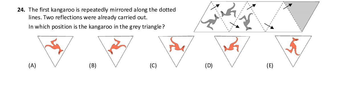 Q24. The first kangaroo is repeatedly mirrored along the dotted lines. Two reflections were already carried out. In which position is the kangaroo in the grey triangle?