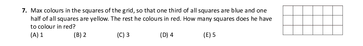 Q7. Max colours in the squares of the grid, so that one third of a ll squares are blue and one half of all squares are yellow. The rest he colours in red. How many squares does he have to colour in red?