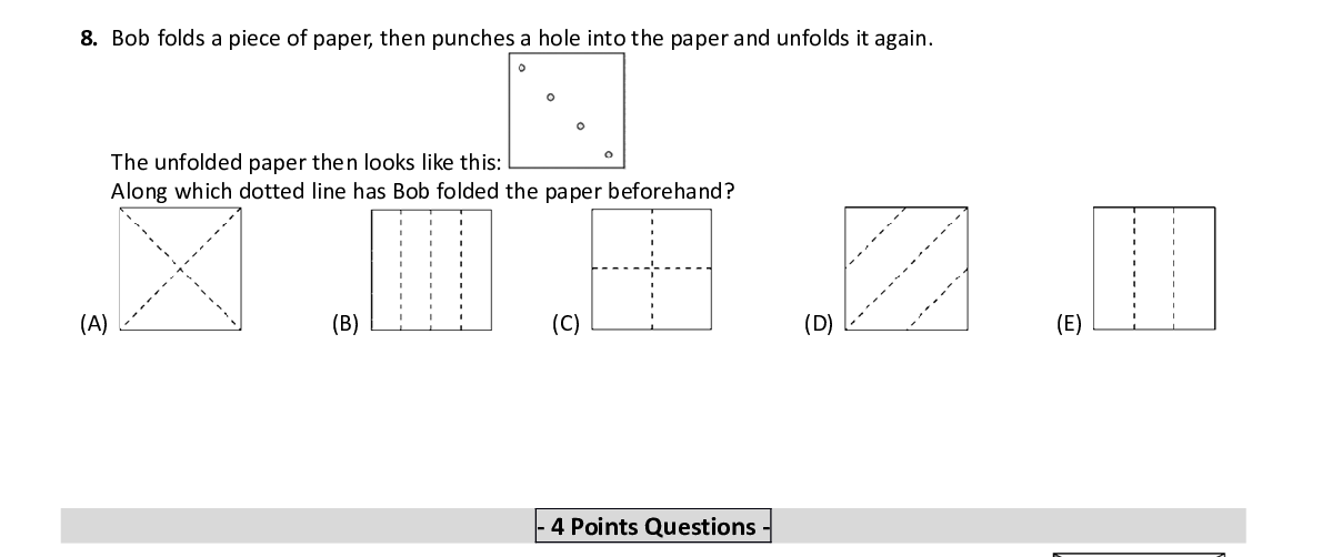 Q8. Bob folds a piece of paper, then pun ches a hole into the paper and unfolds it again. The unfolded paper then looks like this: Along which dotted line has Bob folded the paper beforehand?