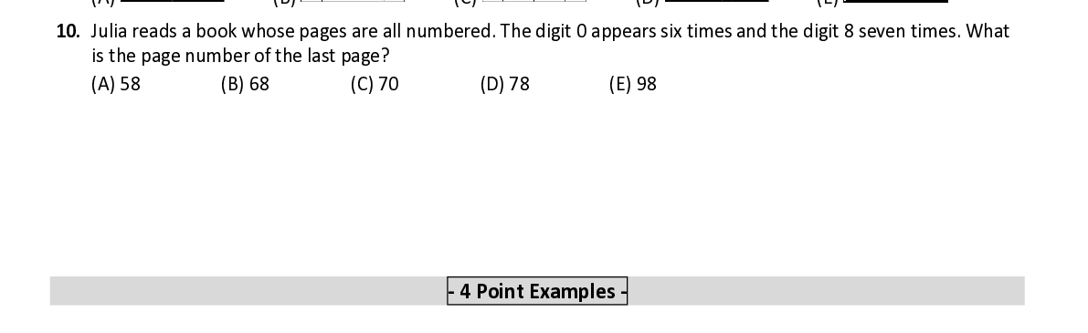 Q10. Julia reads a book whose pages are all numbered. The digit 0 appears six times and the digit 8 seven times. What is the page number of the last page?