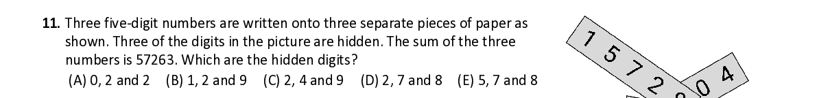 Q11. Three five-digit numbers are written onto three separate pieces of paper as shown. Three of the digits in the picture are hidden. The sum of the three numbers is 57263. Which are the hidden digits?