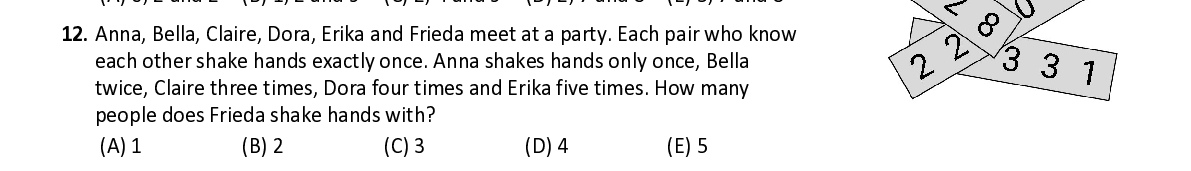 Q12. Anna, Bella, Claire, Dora, Erika and Frieda meet at a party. Each pair who know each other shake hands exactly once. Anna shakes hands only once, Bella twice, Claire three times, Dora four times and Erika five times. How many people does Frieda shake hands with?