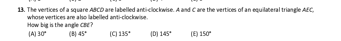 Q13. The vertices of a square ABCD are labelled anti-clockwise. A and C are the vertices of an equilateral triangle AEC , whose vertices are also labelled anti-clockwise. How big is the angle CBE ?