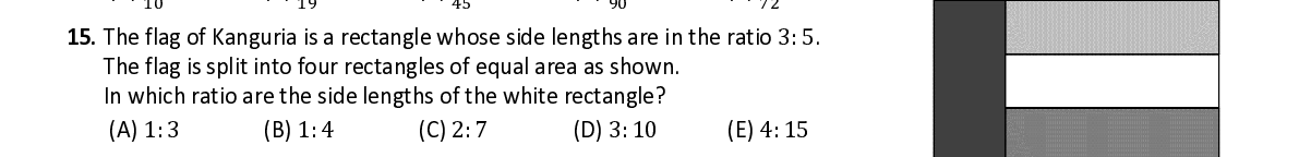Q15. The flag of Kanguria is a rectangle whose side lengths are in the ratio 3:5 . The flag is split into four rectangles of equal area as shown. In which ratio are the side lengths of the white rectangle?